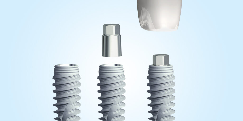 Un implante dental es una raíz artificial, generalmente de titanio, que se inserta en el maxilar y sustituye la raíz natural del diente perdido. Está diseñado para integrarse de manera biocompatible con el hueso y la encía, y sirve como soporte para una corona o prótesis que restaura la función y la estética dental.